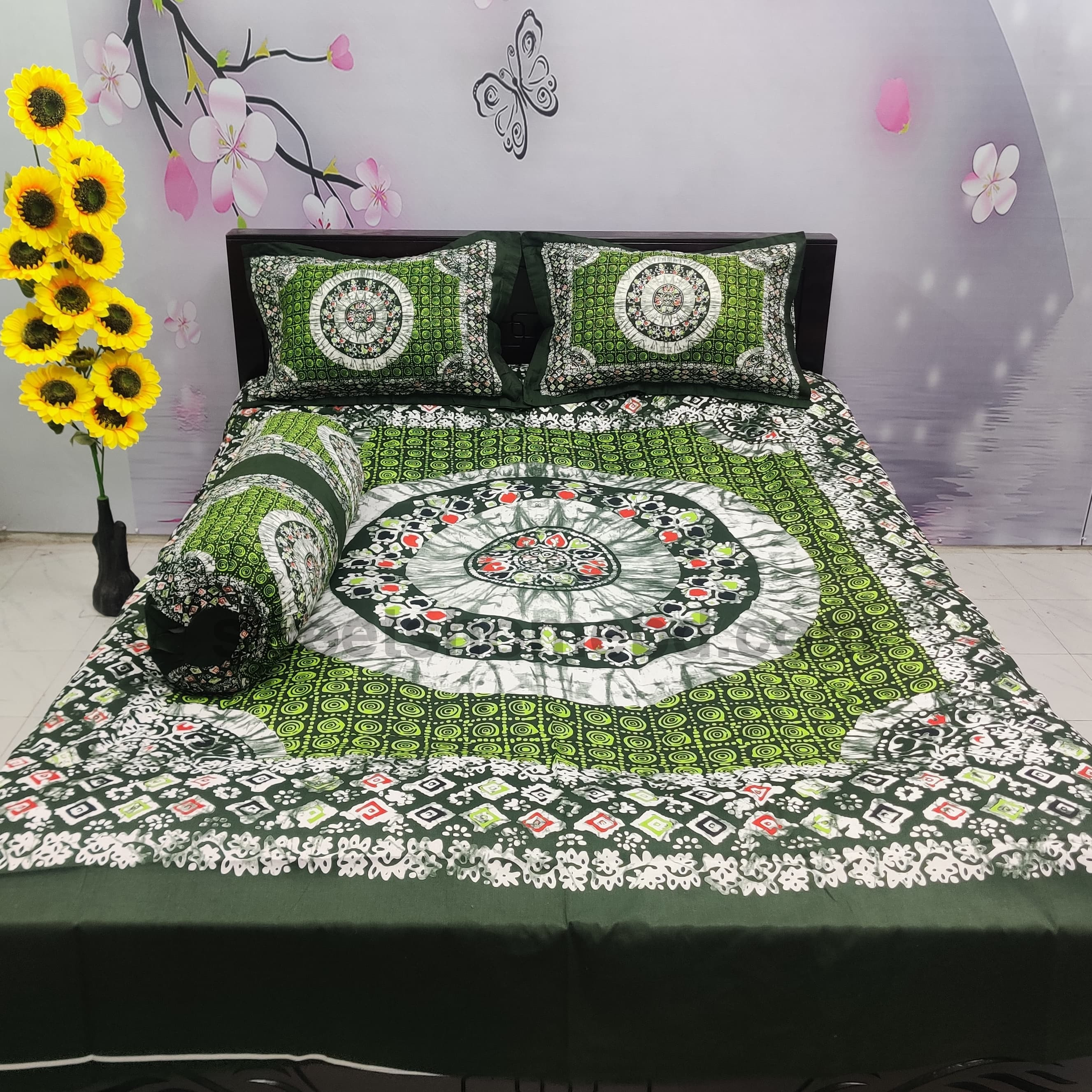 সাথে দুটো সেলাই করা মাথার বালিশের কাভার ও কোল বালিশের কভার আছে